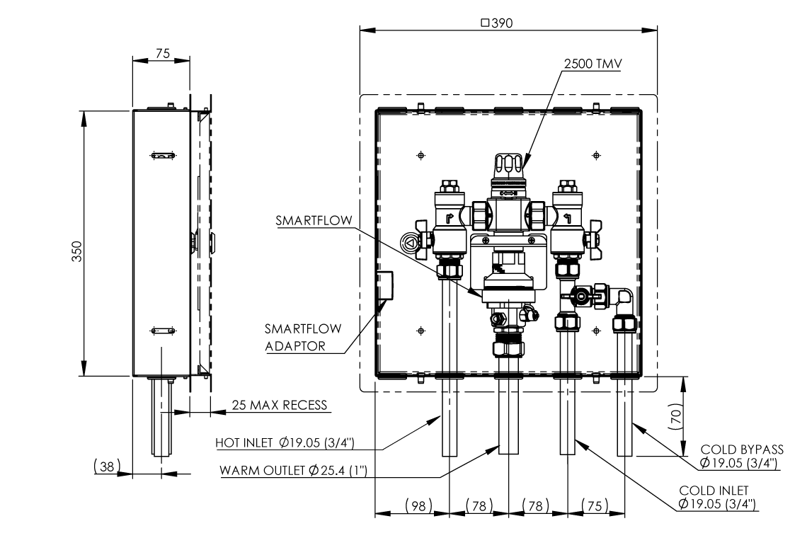 - 20mm Copper Inlet tails and Cold Water Bypass and 25mm Copper Outlet tail
