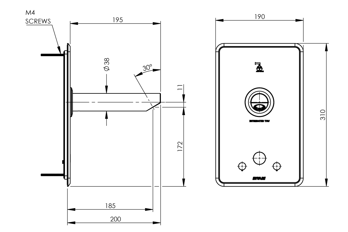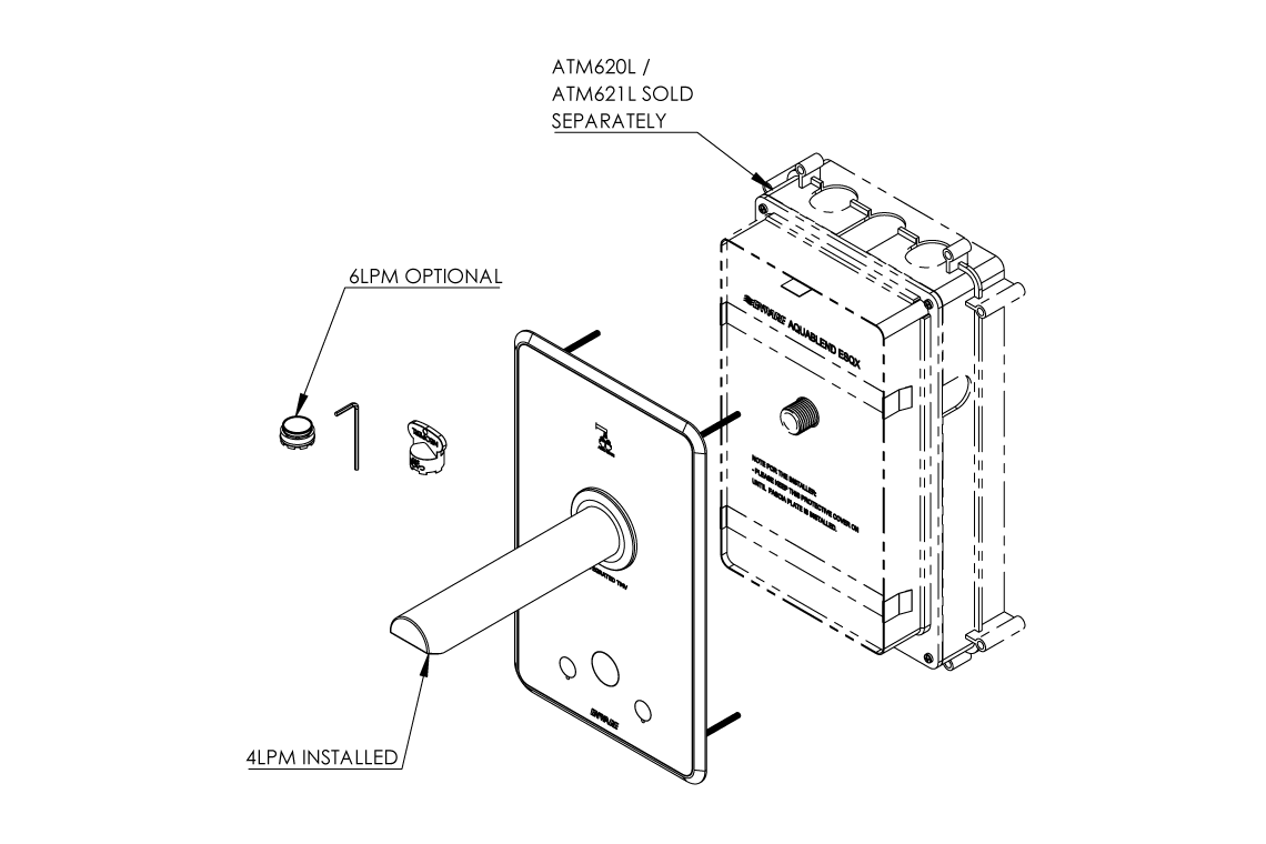 Aquablend eSQX MK2 Touch-Free Auto Sense Point-of-Use Thermostatic Wall Mixer with 200mm Spout 4/6Lpm Laminar Mains/Battery - Front of Wall Component