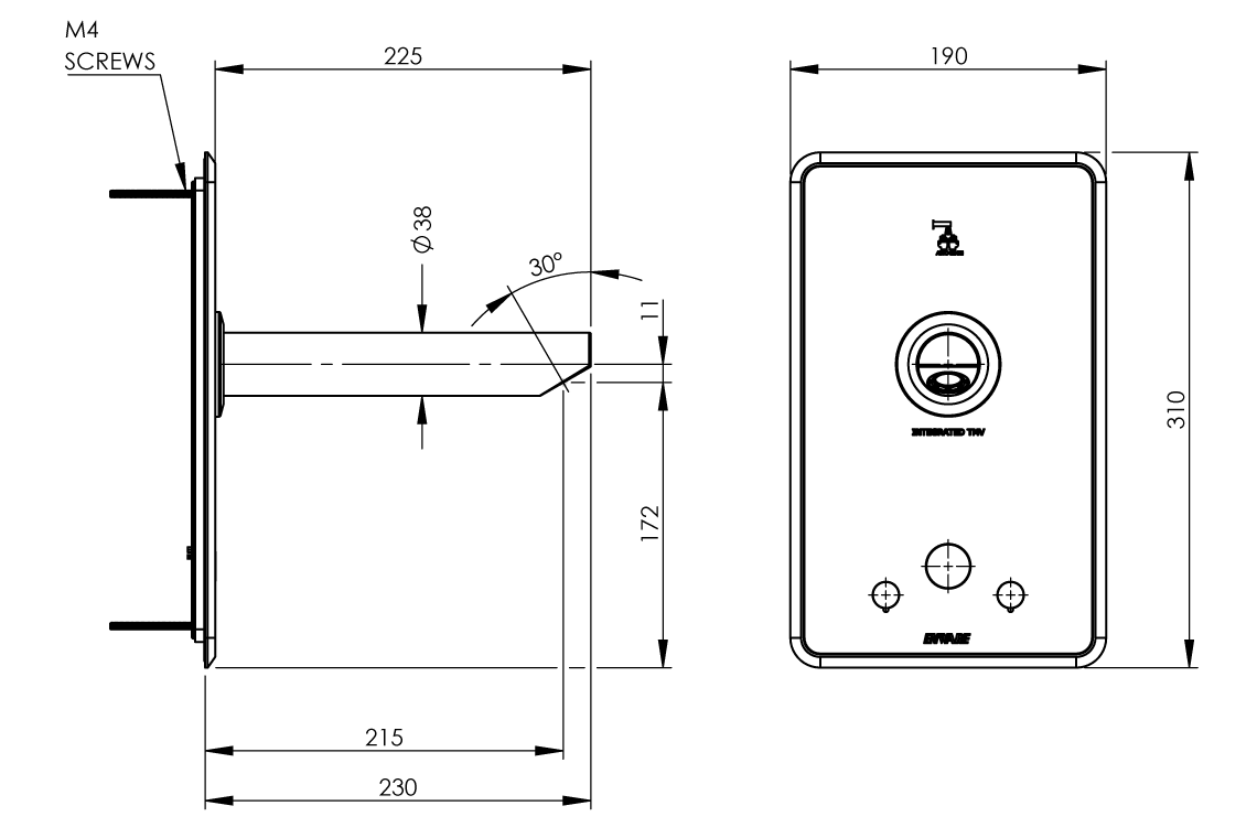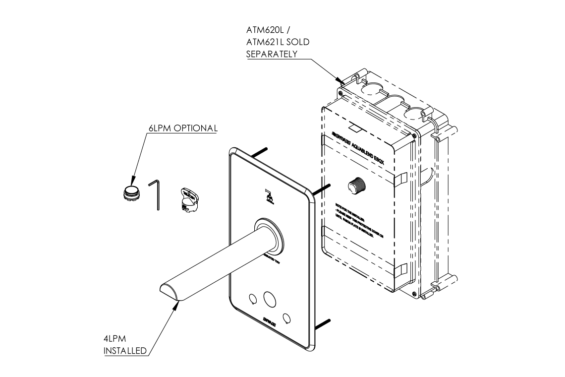 Aquablend eSQX MK2 Touch-Free Auto Sense Point-of-Use Thermostatic Wall Mixer with 230mm Spout 4/6Lpm Laminar Mains/Battery - Front of Wall Component
