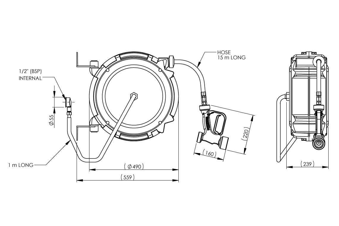 Hot or cold wash down hose reel with food service trigger spray. Suitable for kitchens, food preparation and food manufacturing areas. 15m retractable hose with a heavy duty wash down spray.