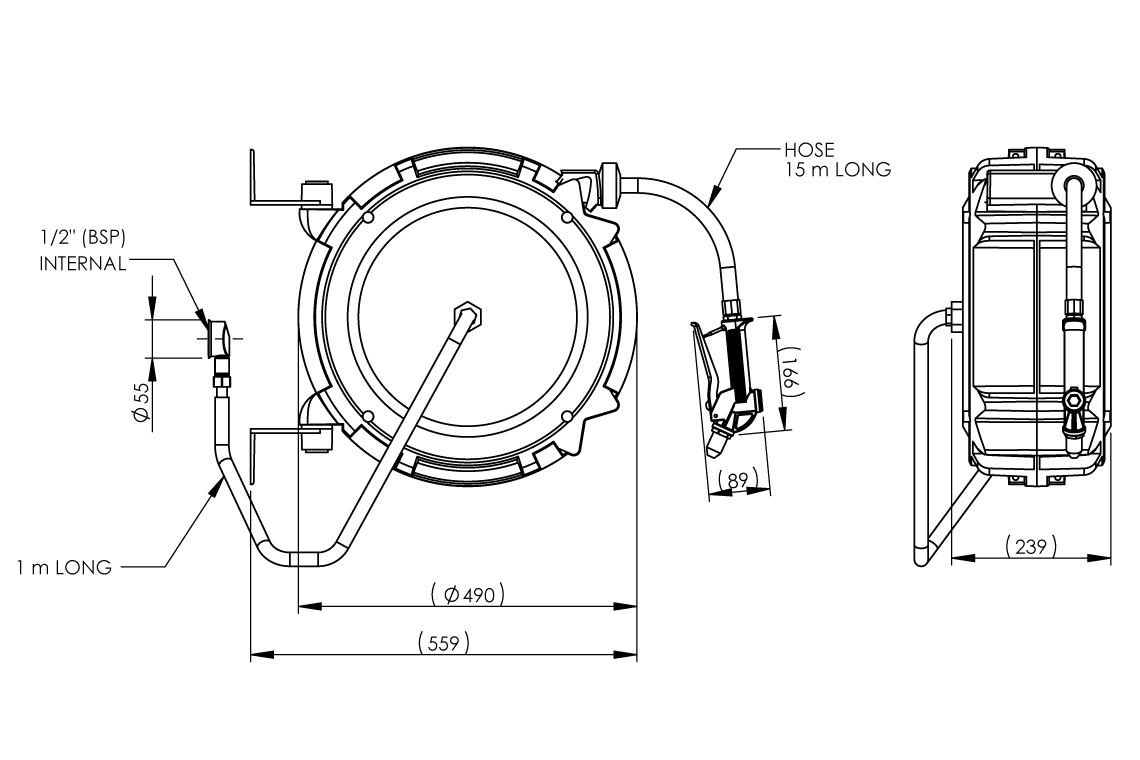 Hot or cold wash down hose reel with food service trigger spray. Suitable for kitchens, food preparation and food manufacturing areas. 15m retractable hose with floor wash jet spray.