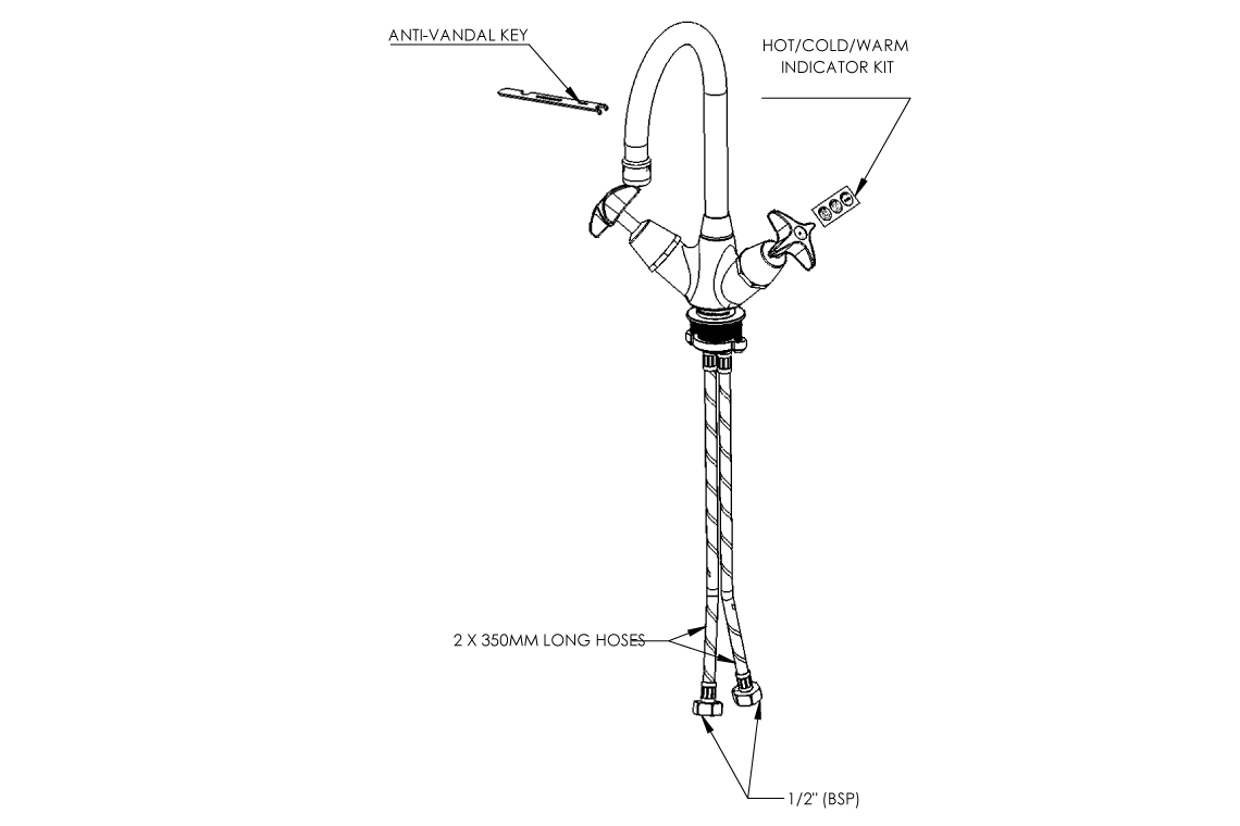 Enware's vandal resistant School Pattern tapware is constructed from dezincification resistant (DR) brass with durable chrome plating and an easy to clean design. The handle features a vandal resistant internal locking ring securing it to the spindle and requires a special key to remove.
