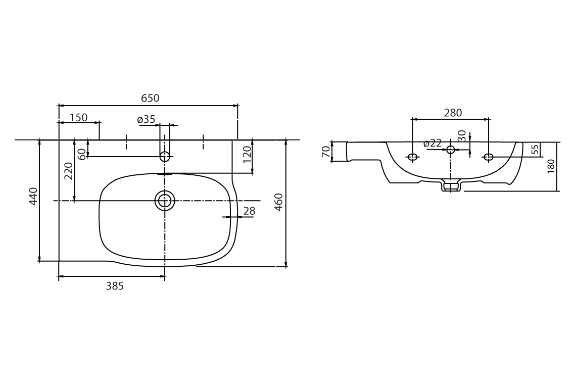 - 650mm long vitreous china basin with shelf and bowl on the right