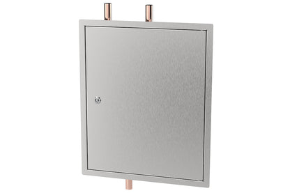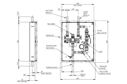 The system design integrates the Aquablend 2500 Thermostatic Mixing Valve to mix the hot and cold water which is then fed back into the inlet feed to the emergency shower and eye wash to ensure a comfortable water temperature meets AS4775. Now comes standard in a stainless-steel cabinet with a hinged lid. New slimline design fits within a 75 mm deep wall cavity.