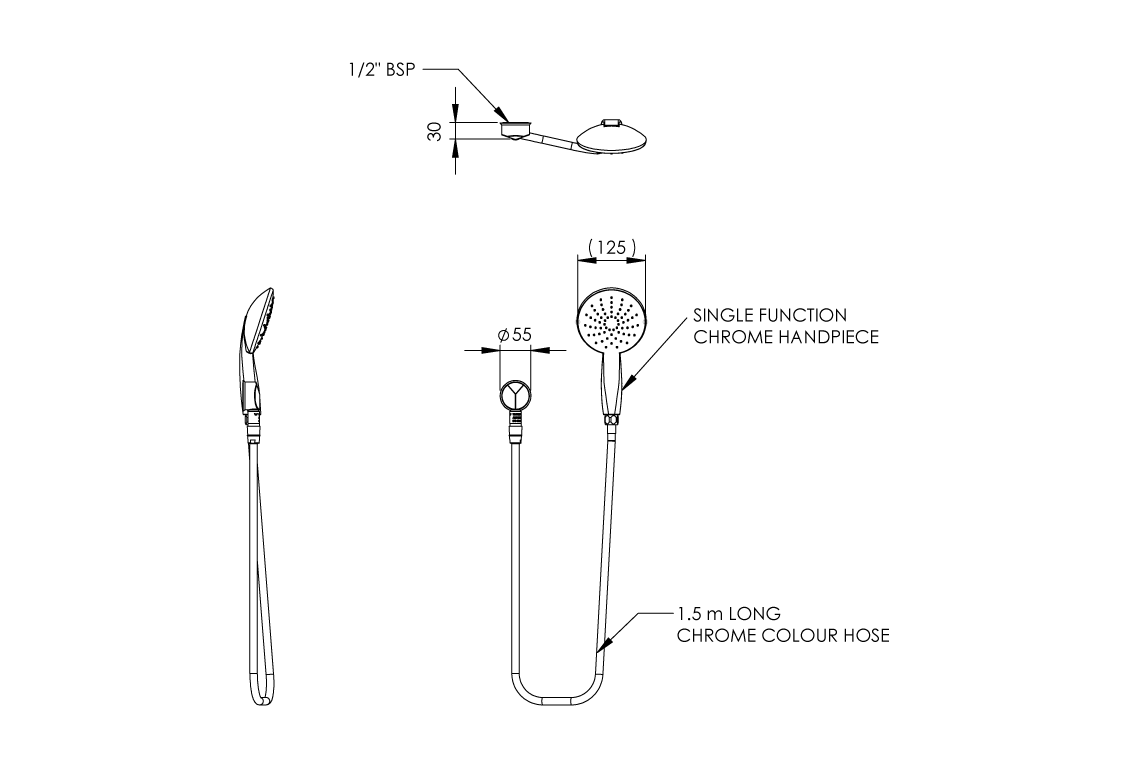 Water efficient handheld shower set with chrome shower head, smooth hose and chrome plated wall elbow with dual check valve.