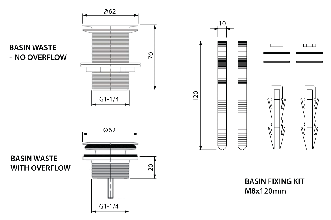 - Waste and mounting bolts included